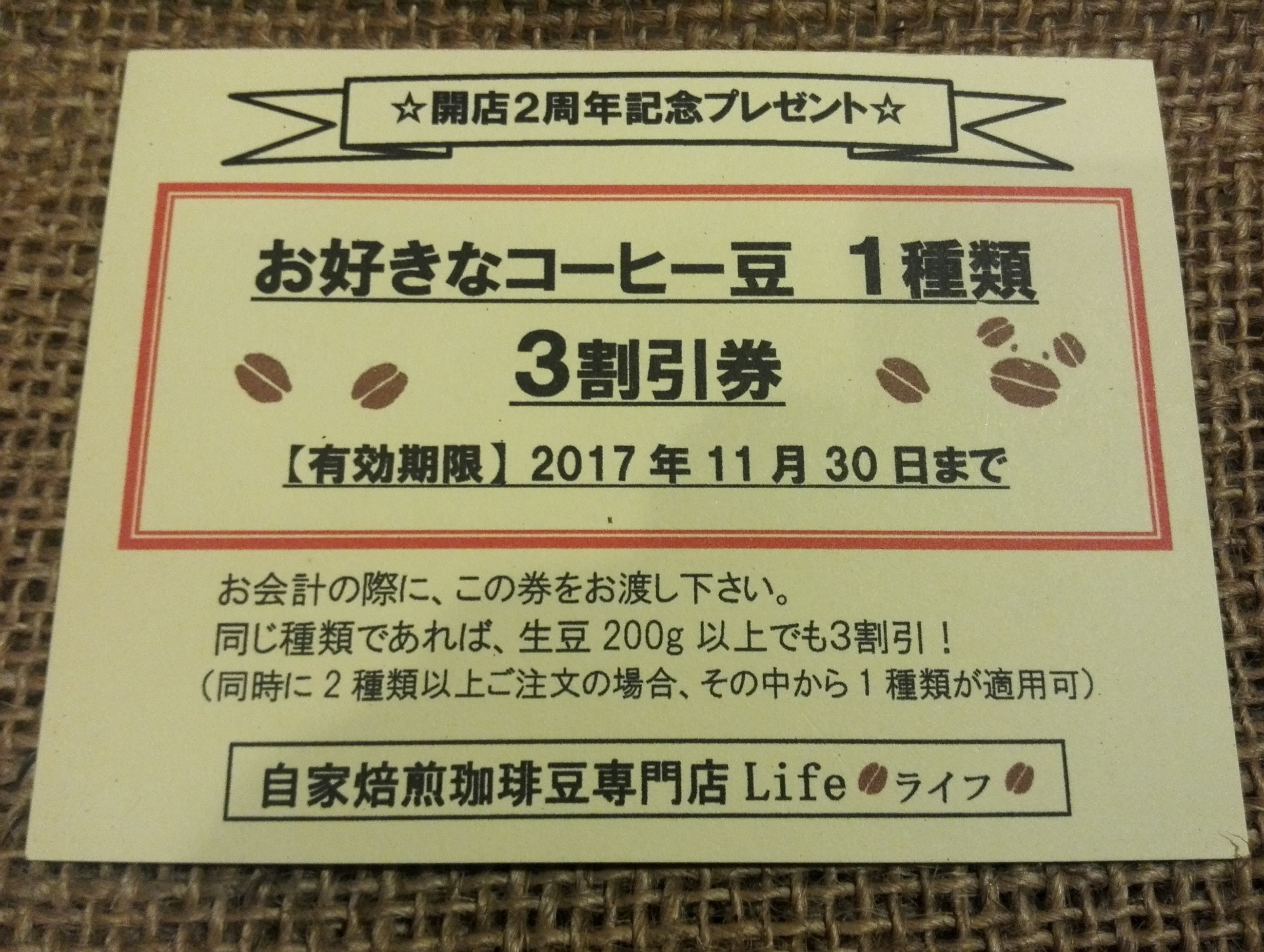 1組様1枚、お好きなコーヒー豆1種類3割引券をお配り致します!