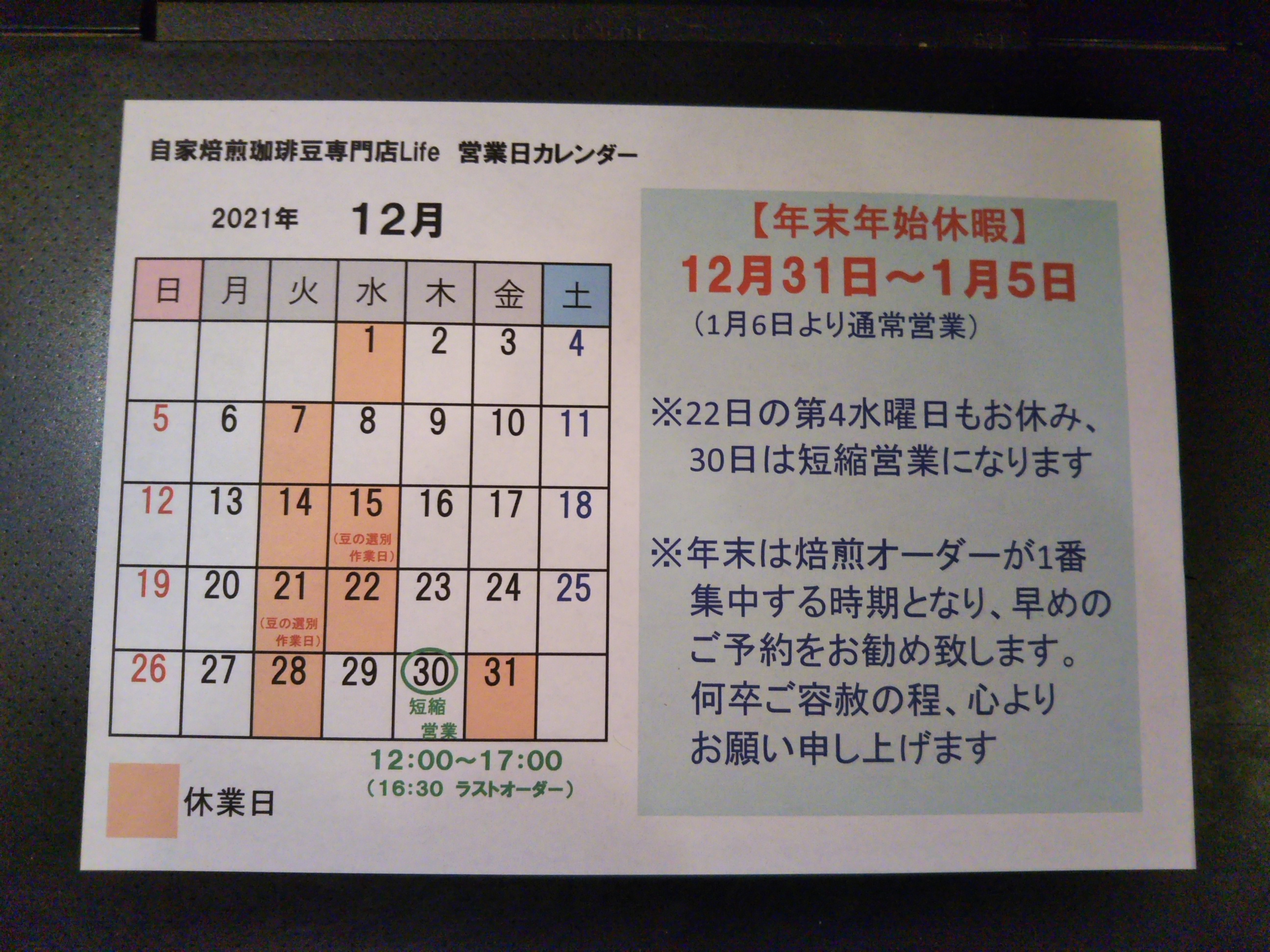 お待たせしました、12月の営業日と