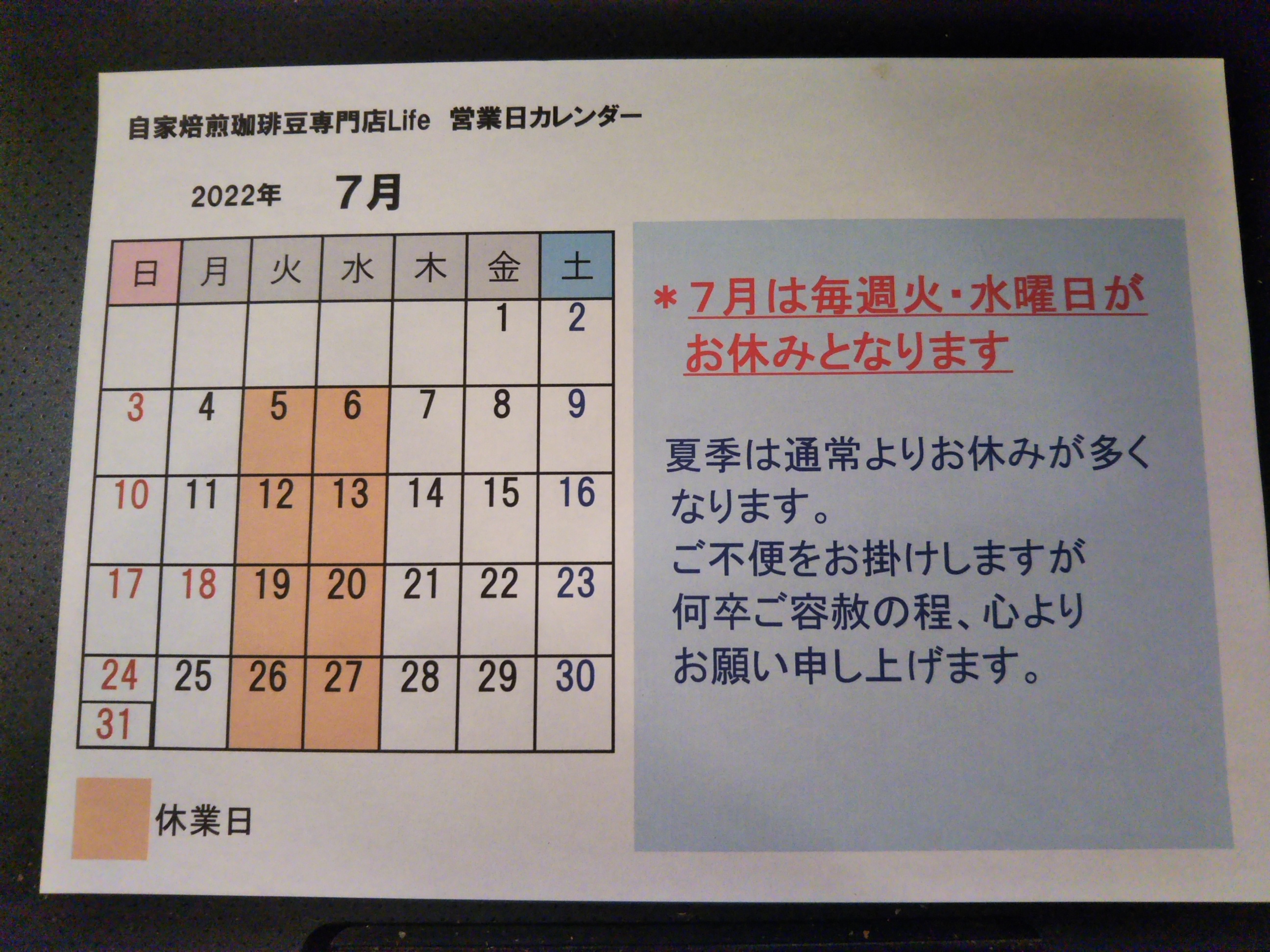 7月の営業日のご案内【毎週火・水曜日お休み】