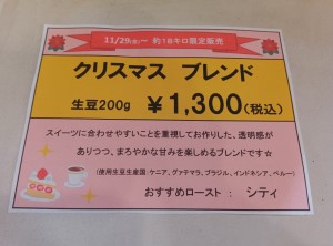 11月29日より約18キロ、「クリスマス ブレンド」販売のお知らせ☆